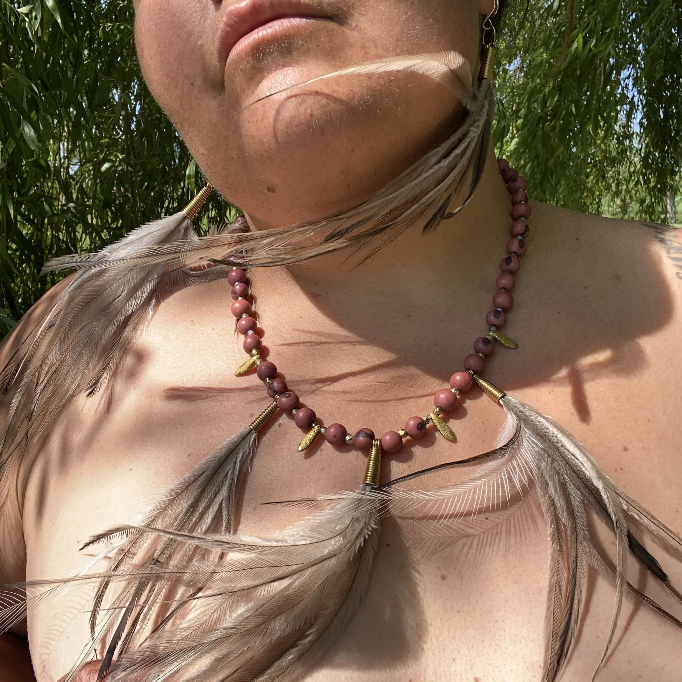 Like all of the bones that I use, these too, have been ethically scourced. The fox who these bones belong to once roamed the lands here in England. Now they will continue their life swinging from the ears of the wearer who these are for. I’ve always had a feeling that their wearer will be tall, with a beautiful long neck. These earring do have some length, given to them by the hand dyed Australian Emu feathers in orange & natural tones. Similar to the coat that once kept these bones warm. Adored with warm earthy green crystal beads & gold accent charms bringing a radiant uplifting feeling when worn. The hand forged golden brass complement these earrings well. I really look forward to seeing who these belong to…